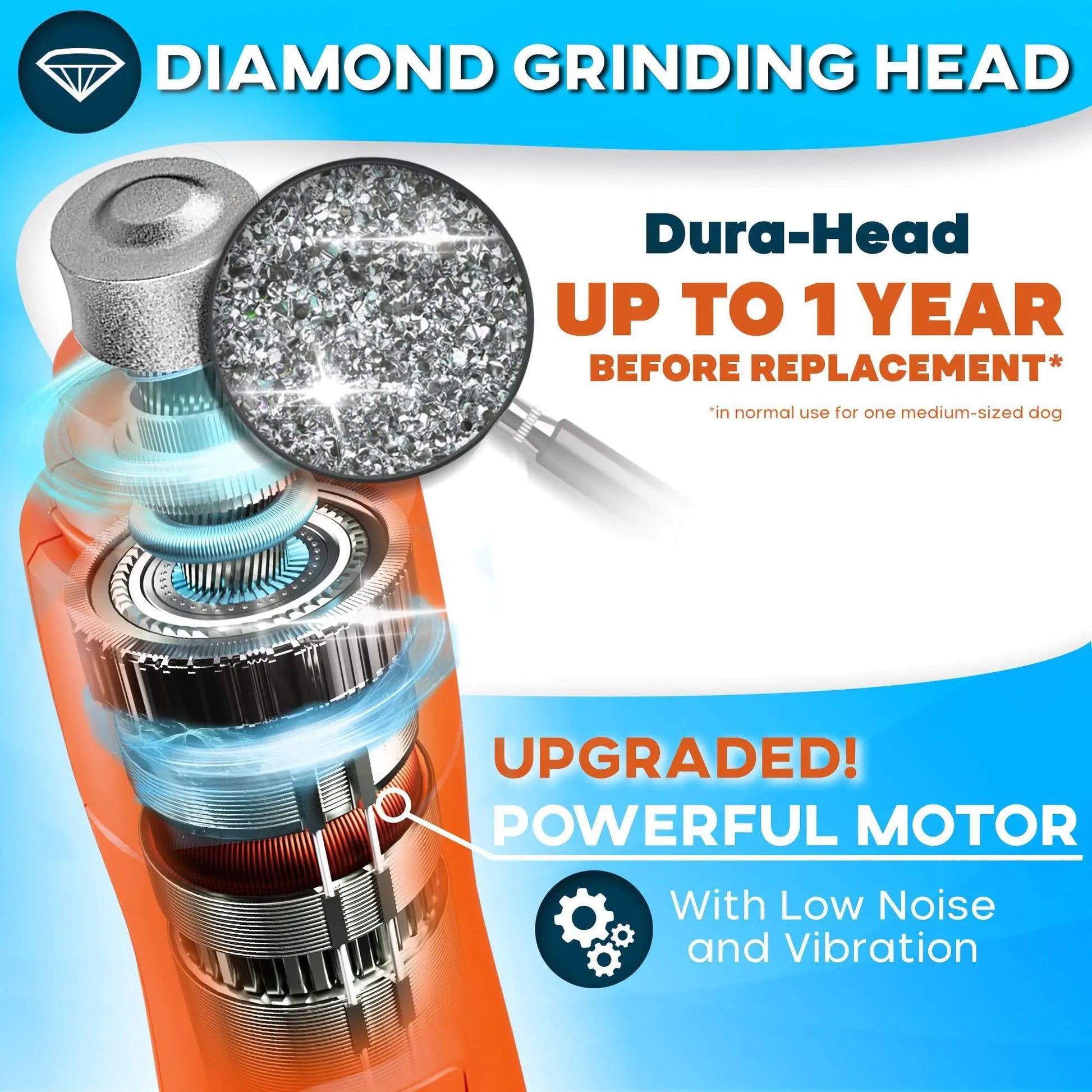 Unlike a dog nail file, our pet nail grinder for dogs is made of high quality plastic, pleasant to the touch and comfortable to hold. This dog nail grinder features a diamond grinder head that allows you to reduce the excessive length of the canine's nails effortlessly.